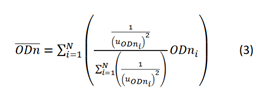 Donde, 𝑢𝐼0 𝑦 𝑢𝐼son las incertidumbres (desviaciones estándar) de las películas sin irradiar e irradiadas, respectivamente. La densidad óptica neta promedio es calculada mediante la media ponderada de las cinco medidas (N) realizadas en la película, obtenida mediante la ecuación (Devic et al., 2016):