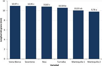 Las variedades Nica, Sesenteno, Vaina Blanca y Turrialba presentaron las semillas más largas, mientras que la variedad Mantequilla mostró las semillas más cortas (Fig. 2). No hallamos diferencias significativas entre las dos accesiones de frijol Mantequilla.