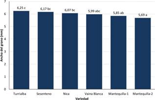 Fig. 3 Ancho de la semilla (mm) para los frijoles nativos de Guanacaste. Medias con una letra en común no son significativamente diferentes entre sí, según la prueba LSD Fisher (p≤0,05).
