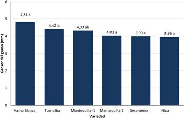 Las variedades Mantequilla, Nica y Sesenteno presentaron las semillas con el menor grosor, mientras que las semillas más gruesas las encontramos en la variedad Vaina Blanca, y la variedad Turrialba registró valores intermedios (Fig. 4). No hallamos diferencias significativas entre las dos accesiones de frijol Mantequilla.