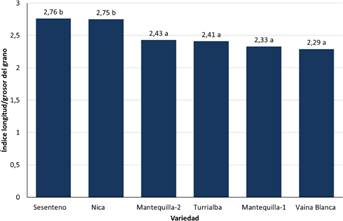 Las semillas con el mayor índice longitud/grosor correspondieron a las variedades Nica y Sesenteno, y estos resultados fueron significativamente superiores en relación con los obtenidos por las demás variedades (Fig. 6).