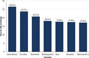 Fig. 8 Peso de 100 semillas (g) para los frijoles nativos de Guanacaste. Medias con una letra en común no son significativamente diferentes entre sí, según la prueba LSD Fisher (p≤0,05).