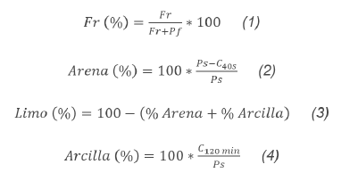 El procedimiento utilizado para el análisis de textura fue el de Bouyoucos (1962). Para determinar el tamaño y la cantidad de partículas presentes en el suelo, se separaron los fragmentos rocosos de las partículas finas a través del tamiz #10 (1), seguidamente se tomaron 40 gramos de partículas finas de suelo, muestra a la cual se le añadió agua destilada y peróxido de hidrogeno (H2O2 35 %) suficiente para eliminar la materia orgánica que le componía.