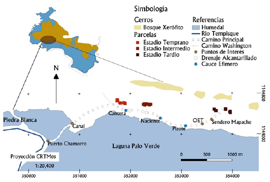 Entre las áreas de sucesión secundaria de la región, está el Parque Nacional Palo Verde (PNPV), creado en el año de 1980 y catalogado Sitio Ramsar desde 1991 (Sistema Nacional de Áreas de Conservación y Convención de Ramsar, 1998). Jaccard, Münster, Baumgartner, Mora y Denyer (2001) indicaron que el PNPV está circunscrito en la formación geológica Barra Honda, ésta se caracteriza por sus cerros calcáreos compuestos en gran medida por roca sedimentaria; también aseguran que el área bajo estudio es producto de actividad tectónica y de origen oceánico. Consecuentemente, los mogotes o forma exokárstica que acompaña el paisaje en el PNPV han sido esculpidos por un proceso de disolución en el que interviene el agua y el dióxido de carbono presente en el aire o el suelo (Ulloa, Aguilar, Goicoechea y Ramírez, 2011).