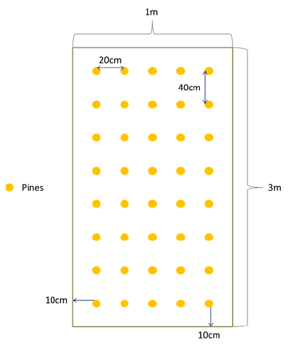 El distanciamiento de los pines fue de 40 cm en sentido longitudinal y de 20 cm transversalmente según la pendiente, mientras que las dimensiones de la parcela fueron de 3 y 1 m de largo y ancho respectivamente (figura 4).
