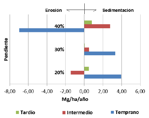 En la figura 5 se muestra para cada estadio de sucesión los valores de erosión o sedimentación acumulada (Mg/ ha/año), distribuidos a la izquierda del cero en valores negativos y a la derecha del cero en valores positivos respectivamente; y agrupados en cada porcentaje de pendiente evaluado. No se encontraron diferencias significativas entre las pendientes de 20, 30 y 40 por ciento (a=0,05; p=0,16). Sin embargo, si se encontraron diferencias significativas entre el estadio de sucesión temprano y los otros dos tipos de cobertura, intermedia y tardía. No hubo diferencias significativas entre el intermedio y el tardío. El estadio de sucesión temprano reportó un valor promedio de erosión hídrica de 4,75 Mg/ ha/año bajo una intensidad de lluvia máxima promedio de 23 mm/15 min (a=0,05; p<0,05).