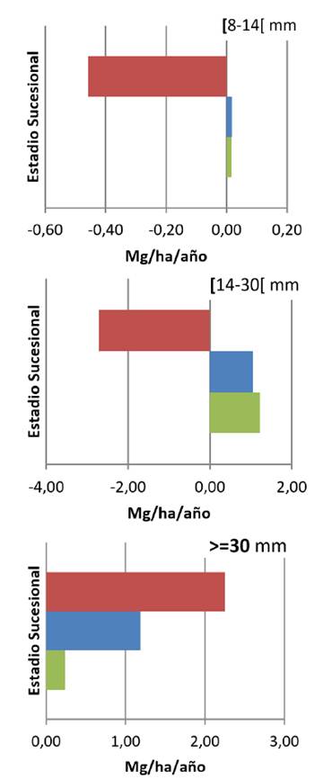La figura 6 muestra los valores promedio de erosión a la izquierda en valores negativos y de sedimentación a la derecha con valores positivos para cada estadio de sucesión en tres gráficos independientes.