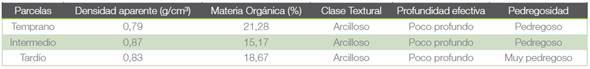 Se determinó la densidad aparente, textura y contenido de materia orgánica del suelo en cada sitio de muestreo. Además, se clasificó la profundidad efectiva y la pedregosidad de forma cualitativa durante el establecimiento de las parcelas, colocando los pines directamente en el suelo y colectando las muestras con barreno en base a la guía de capacidad de uso de la tierra (Cubero, 2001).
