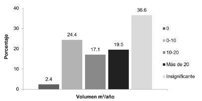 Construcción: de los individuos encuestados en el segmento de la construcción, el 59,7 % correspondió a ingenieros civiles y el restante 40,2 % a arquitectos, todos ellos con más de 5 años de experiencia y dos terceras partes (66,3 %) con más de 15 años ejerciendo su profesión. El 44 % de ellos algunas veces utilizan madera en los diseños y sólo un 18 % mencionan utilizarla siempre. Un 36,6 % calificaron como “insignificante” el volumen de madera utilizado en sus diseños, algo que varía dependiendo de los gustos de los clientes. La mayoría (43,9 %) utiliza entre 0 y 20 m3 de madera al año y solamente un 19,5 % utiliza más de 20 m3 (figura 2).