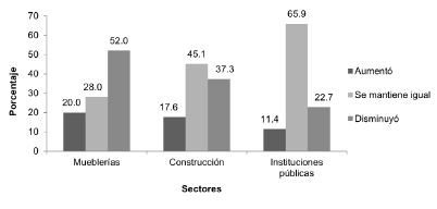 El 52 % de las mueblerías consideran que la demanda de madera en los últimos dos años disminuyó considerablemente. Sin embargo, tanto las empresas de construcción como las instituciones públicas consideran que la demanda de madera en el país se mantuvo constante, con un 45,1 % y 65,9 %, respectivamente (Figura 3).