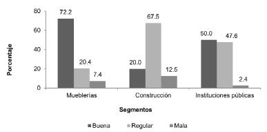 El 72,2 % de las mueblerías, consideran que la calidad de la madera local es buena y sólo el 7,4 % la califican como mala. Por el contrario, el sector construcción, en su mayoría (67,5 %), consideran que la calidad es regular y sólo un 20 % la consideran como buena. Para las instituciones públicas, la calidad de la madera local se encuentra entre buena y regular, con un 50 y 47,6 %, respectivamente (Figura 4).
