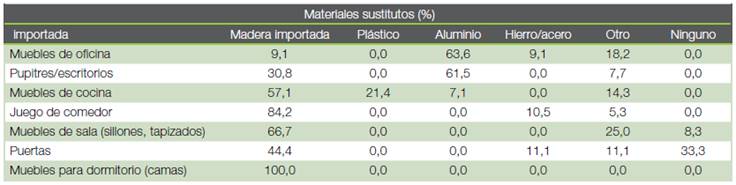 El 64 % de las mueblerías se abastecen de madera de productores nacionales, un 16 % importa toda la madera debido a su calidad y facilidad para trabajar. El restante 20 %, se abastecen de madera de procedencia mixta, siendo 30 % nacional y 70 % importada, dependiendo de los requerimientos del cliente o de los productos a fabricar. Adicionalmente, y como se muestra en el Cuadro 1, las empresas fabricantes de muebles consideran que los productos fabricados con madera importada son los principales competidores, destacando los juegos de comedor (84,2 %), muebles de sala (66,7 %) y camas (100 %). El aluminio ha reemplazado significativamente la madera local en la elaboración de muebles de oficina (63,6 %) y pupitres/escritorios (61,5 %).