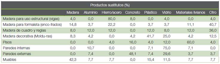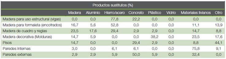 Los principales materiales que compiten con la madera local en la construcción son la madera importada, el hierro o acero, el concreto y los materiales livianos. Por ejemplo, en lo que respecta a estructuras como vigas, el hierro se utiliza en un 77,8 %; la madera importada se utiliza en un 23,5 % como madera de cuadro y reglas; el concreto en un 50 % para paredes externas, y los materiales livianos en un 75,8 % para la elaboración de paredes internas. Los pisos de cerámica o porcelanato sustituyen a la madera en un 44,1 % (cuadro 2).