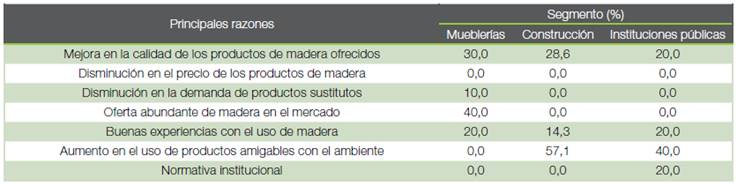 Sólo una pequeña parte de los encuestados en los tres segmentos coincide que la demanda de madera aumentó en los últimos años: 20 % para el sector de las mueblerías, 17,6 % para el de construcción y 11,4 % para las instituciones públicas; siendo la “oferta abundante de madera en el mercado” la principal razón de aumento para el sector de las mueblerías, con un 40 % y el “aumento en el uso de productos amigables con el ambiente” para el sector construcción e instituciones públicas, con un 57,1 % y 40 %, respectivamente (Cuadro 4).