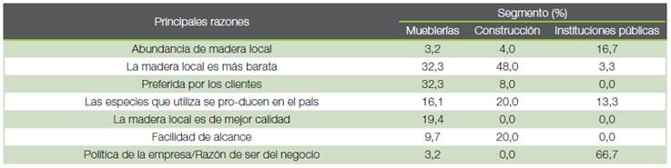 Entre las principales razones por las que el segmento de las mueblerías se abastece de madera local destacan el ser más barata y preferida por los clientes en un 32,3 %. De igual forma, para el sector construcción, la principal razón por la que se compra madera local es debido a su bajo costo (48 %). Por otro lado, la principal razón para las instituciones públicas es debido a que la compra de madera local es por política institucional (66,7 %) (Cuadro 6).