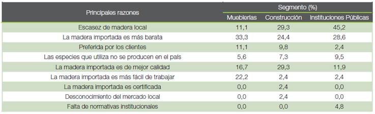 La principal razón por la que el segmento de mueblerías se abastece de madera importada, es por su bajo precio y facilidad para trabajarla, debido a que ya viene cepillada y seca. El segmento de la construcción se abastece de madera importada principalmente por la escasez de madera local (29,3 %) y la buena calidad de la importada (29,3 %). De igual forma, las instituciones públicas la compran debido al desabastecimiento del mercado con madera local (45,2 %) (Cuadro 7).