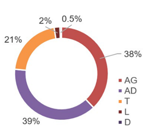 La distribución del volumen total promedio por árbol de acuerdo con el producto fue: AD con un 38,5 % (0,27 m3), seguido por AG con 38 % (0,26 m3) y T con 21 % (0,15 m3). En cuanto L y D los árboles de Pocora registraron menores valores con un 2,0 % (0,01 m3) y 0,5 % (0,003 m3) respectivamente (Figura 3).