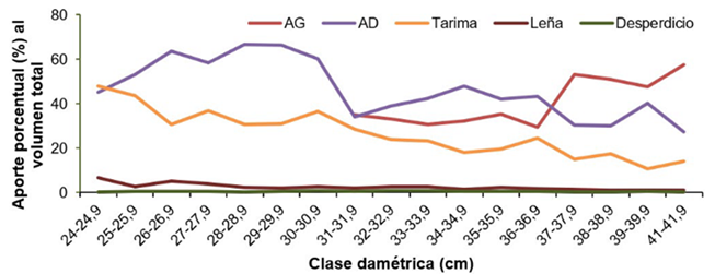 Del mismo modo, la diversificación de los productos aumentó con respecto al incremento del DAP de los árboles, estando presentes los cinco productos a partir de los 31 cm (Figura 2). En otros estudios se ha reportado que los árboles aportan volumen para los cinco productos a partir de los 25 cm en cedro (17) y 30 cm para teca (2). En diferentes índices de sitio para teca de nueve años los diámetros variaron, por ejemplo, en un IS 27 se registraron las cinco categorías a partir de los 20 cm y en un IS 21 no se reportó volumen para AG (18).