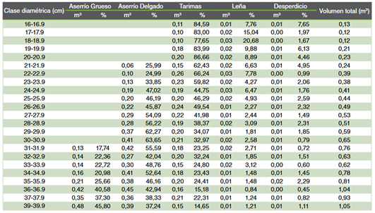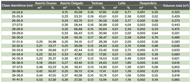Para tarimas, los máximos valores de volumen se registraron entre los 16 a 20,9 cm de diámetro, con un aporte promedio de 83,18 %. Las T fueron el producto dominante en las clases diamétricas menores a 27 cm y la menor contribución para el volumen total se dio a los 39 cm (14,65 %) (Cuadro 3 y Cuadro 4). Barrantes et al. (18), presentaron un comportamiento similar a la melina en árboles de teca, siendo el producto de T el dominante en las clases diamétricas menores (10 hasta los 24,9 cm). En cedro, el aporte de las T fue relativamente bajo, superiores a 18 % en las tres primeras categorías diamétricas y menores a 10 % a partir de los 40 cm (17).