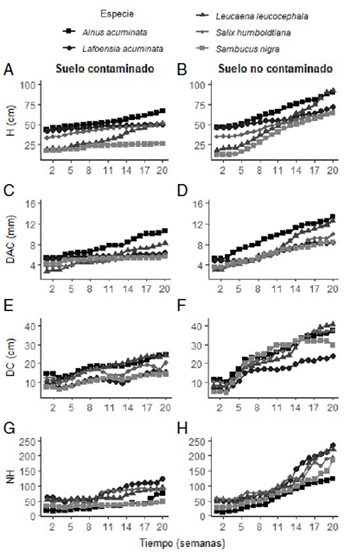 Las especies forestales seleccionadas fueron: Salix humboldtiana Willd. (sauce), Alnus acuminata Kunth (aliso), Lafoensia acuminata (Ruiz & Pav.) DC. (guayacán de Manizales), Leucaena leucocephala (Lam.) de Wit (leucaena) y Sambucus nigra L (sauco). Estas especies se seleccionaron por ser representativas de la región, su adaptación al clima andino, y disponibilidad de material vegetal en viveros. Por cada especie, se sembraron cinco plántulas en el suelo contaminado y cinco en el no contaminado. A escala semanal (por 20 semanas), se midieron variables de crecimiento como el diámetro a la altura del cuello (DAC), altura (H), diámetro de copa (DC) y número de hojas (NH). La profundidad de la raíz (PR) se midió únicamente al final del ensayo, extrayendo los individuos de los contenedores.