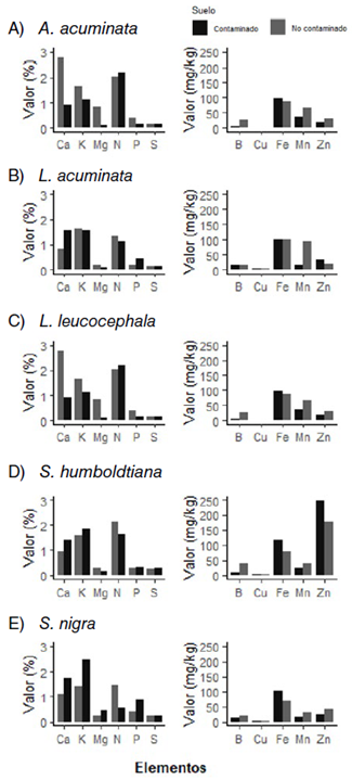 En el suelo contaminado, la mayoría de las especies (excepto A. acuminata) presentaron una menor concentración de nitrógeno en el sistema foliar, con respecto al suelo no contaminado. Las especies del suelo no contaminado presentaron, en general, bajos niveles de fósforo (0,18% - 0,4%), mientras que, en el suelo contaminado, las especies S. nigra, L. acuminata y S. humboldtiana presentaron las mayores concentraciones de este elemento (0,32% - 0,87%). La mayoría de las especies del suelo contaminado (excepto A. acuminata) presentaron mayores niveles de calcio (>1,41%) (Figura 2). En ambos tratamientos, todas las especies presentaron una baja concentración de magnesio (> 1%), siendo A. acuminata la que presentó la mayor concentración en el suelo no contaminado (0,85%), y S. nigra la especies que presentó los mayores niveles en el suelo contaminado (0,44%). Igualmente, todas las especies en ambos tratamientos presentaron bajos niveles de azufre (> 0,29%), siendo S. humboldtiana y S. nigra las especies con mayores valores.