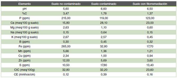 En el suelo no contaminado se encontró una textura franco-arenosa, un pH de 5,6 y un contenido de materia orgánica de 3,47 %, niveles altos en hierro (265 ppm), calcio (15,8 meg/100g), zinc (12 ppm) y potasio (2,67 meg/100g). Por su parte, el suelo contaminado presentó una textura franca arcillo arenosa, mayor pH (6,6), pero con menor cantidad de materia orgánica (1,78 %). Este último mostró niveles altos en calcio (28,1 meg/100g) y azufre (17,8 ppm). La CIC en ambos suelos fue similar, mientras la conductividad eléctrica fue mayor en el suelo contaminado (Cuadro 1).