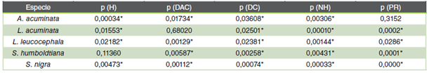 Se encontraron diferencias significativas en el crecimiento de la H (siendo mayor en los suelos no contaminados) en cuatro especies (P < 0,05); S. humboldtiana no presentó diferencias entre tratamientos (P > 0,05), para el DC y NH de todas las especies estudiadas presentaron diferencias entre tratamientos (P < 0,05), sin embargo, las especies que muestran una mayor diferencia de NH son S. nigra y L. acuminata, seguidas de L. leucocephala, A. acuminata, S. humboldtiana. También se encontraron diferencias entre tratamientos para las especies S. nigra, S. humboldtiana, L. acuminata y L. leucocephala (P < 0,05); mientras que A. acuminata no presentó diferencias (P > 0,05) (Cuadro 2).