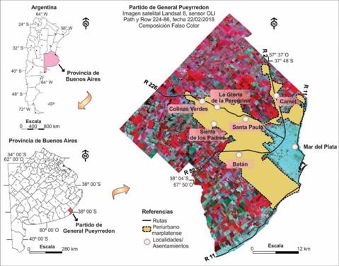 En función de lo señalado, el objetivo del presente trabajo es identificar los usos del suelo presentes en el periurbano de Mar del Plata hacia el año 2018 y caracterizar la evolución de la actividad hortícola desde sus inicios hasta la actualidad. Previo a ello, es necesario definir la ocupación de suelos en el partido de General Pueyrredon. Si bien a nivel internacional y regional existen antecedentes donde se emplea la teledetección como insumo para analizar estas áreas (Baldini et al., 2016; Borràs et al., 2017; Mari, 2018; Suez et al., 2018; Lone y Mayer, 2019), en el partido de General Pueyrredon este tipo de estudios aún son escasos (Zulaica et al., 2012; 2013). De esta manera, se espera establecer una tipología de usos mediante clasificación digital que permita analizar espacios heterogéneos, como son los periurbanos, especialmente asociados con áreas de producción intensiva.