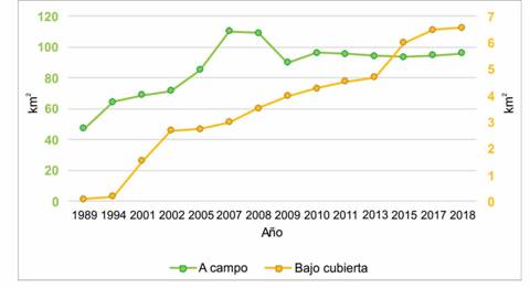 Considerando trabajos previos (Zulaica et al., 2013) y los resultados obtenidos en la clasificación supervisada, desde el año 1989 hasta la actualidad se evidencia una clara expansión de la actividad que asciende a un 115,88%. Al momento de discriminar entre áreas a campo y bajo cubierta (Figura 3), es posible afirmar que las primeras mostraban un crecimiento constante hasta el año 2007, donde comenzaron a descender. Desde el año 2010 hasta el presente las superficies se mantuvieron estables y sin mayores modificaciones, alcanzando valores entre 94 km2 y 96 km2. En relación con las áreas bajo cubierta, el avance fue paulatino, sin grandes saltos desde el mismo año.