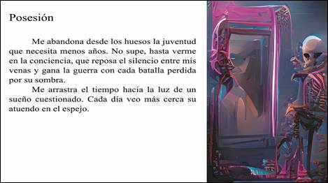 Se puede observar que la imagen (o ilustración) facilita ubicarse en el campo semántico general del proemato, en este caso la muerte. Sin embargo, permite al mismo tiempo seguir alguna o varias líneas de ese campo. El texto, según el lector, puede contar sobre una persona que se entera de su muerte; de igual forma, permite hablar sobre la juventud que no se piensa anciana hasta que de un momento a otro ve cada vez más adulta la vejez en el espejo; o bien, reflexionar sobre el debate entre «me siento joven, pero me veo viejo»; también se puede pensar en por qué nos tratamos diferentes, no importa nuestro físico, estado económico o creencias, todos moriremos; así lo dice cualquier espejo con el paso de los años. Como se mencionó antes, aunque la imagen ayuda a contextualizar el proemato, no limita la historia o el mensaje para el lector, pues le permite crear su propia interpretación, su propia aventura sobre las palabras.