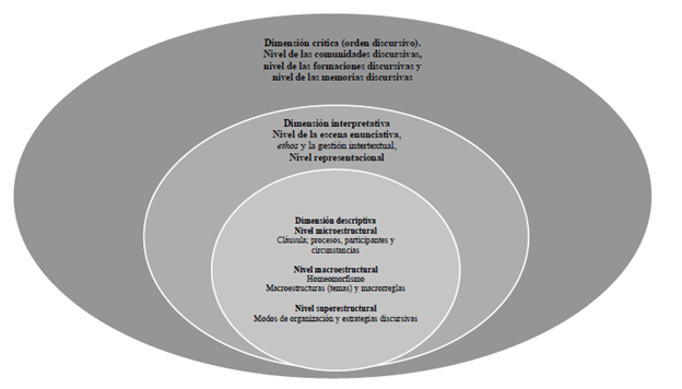 | Nivel | Micro estructural | Macro estructural | Super estructural | Escena enunciativa | Estructural de las RSyD | Comunidades discursivas | Formaciones discursivas | Memoria discursiva | |