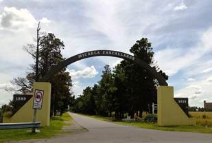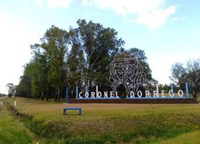 Por otra parte, y aun excluyendo de la consideración los topónimos por la razón citada, cabe destacar que la máxima prominencia visual en el paisaje rural les corresponde a los nombres de las localidades que se exhiben en las proximidades del ingreso a ellas, en particular por el tamaño con que se los presenta, pero también por la elaboración de los soportes que se les suelen proveer -como pedestales o arcos- y sus diversos ornatos, según puede verse en las Figuras 10 y 11. De este modo, la mayor prominencia visual en el paisaje rural corresponde a intervenciones producidas no en dirección bottom-up, como ocurre en el paisaje urbano en la cartelería comercial, sino en dirección top-down.