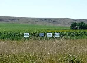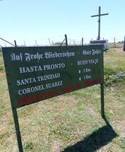 Ya no en relación con la onomástica, pero sí con las lenguas de herencia, el paisaje rural presenta un aspecto más que es digno de atención: si bien excepcionalmente, es posible encontrar lenguas de grupos migrantes en algunos caminos de acceso a localidades oportunamente conformadas por migración concertada. Tal es el caso del Pueblo San José del distrito de Coronel Suárez: en el camino que lleva a ese pueblo, fundado a finales del siglo XIX como colonia agrícola por inmigrantes de origen germano provenientes de una colonización en Rusia (y, por ello, conocidos como «alemanes del Volga»), el saludo de despedida a los visitantes, que se muestra en la Figura 16, se encuentra tanto en español como en alemán27.