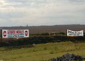 Corrientemente, los carteles que se secuencian y hasta agrupan cerca de las localidades remiten con preferencia a bienes y servicios ofrecidos en ellas (servicio mecánico, restaurantes, hospedajes, entre otros); en cambio, los carteles que se visualizan aisladamente promocionan por lo general insumos y servicios estrictamente rurales (maquinarias agrícolas, semillas para siembra, inmobiliarias dedicadas a la compra y venta de campos), como lo hacen también los carteles -más esporádicos- que, suspendidos sobre alambrados, publicitan las marcas de los insumos utilizados en los establecimientos rurales18 en los que se exhiben o los datos de quienes los comercializan en la localidad más próxima. Las fotografías que siguen muestran tal cartelería promocional, con estructuras de exhibición propias (Figura 12) o sobre alambrados (Figura 13).