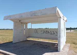 Finalmente, y para concluir este repaso por las características observadas en el paisaje lingüístico rural de la región, señalamos que para la casi totalidad de las producciones expuestas se han provisto expresamente los soportes correspondientes. Son pocos los «signos parásitos» observados y, a diferencia del entorno urbano, exclusivamente en dirección bottom-up: no solamente los promocionales ya comentados que se valen de alambrados, sino también, con el mismo modo de exhibición, propagandas políticas vinculadas con procesos electorales en curso, como lo muestra la Figura 17. Fuera de este modo de exhibición, solamente encontramos mensajes que usufructúan como soportes superficies previstas para otros fines en el caso de inscripciones realizadas sobre bienes públicos, como alcantarillas y la propia señalética; tales inscripciones no son frecuentes y se las observa concentradas únicamente en las garitas que han sido emplazadas en intersecciones de rutas nacionales o provinciales con caminos de acceso a centros poblacionales, destinadas a guarecer a quienes esperan el paso del transporte público automotor de media o larga distancia, como puede verse en la Figura 18. Dada la infrecuencia arriba señalada y que la concentración se restringe al interior de las garitas, se concluye que el conjunto de los «signos parásitos» tiene escasa visibilidad en el paisaje lingüístico rural. En ese conjunto, por otra parte, los de mayor visibilidad son los que, para propiciarla, fueron ubicados sobre alambrados y que, justamente por ser promocionales, no son nunca anónimos, a diferencia de los producidos en dirección bottom-up que suelen encontrarse en el entorno urbano de Bahía Blanca, que -según puede verse también en el estudio de Fotti Berdasco (2023)- lo son con frecuencia.