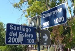 El paisaje lingüístico de Bahía Blanca, en coincidencia con lo relevado en múltiples investigaciones sobre el paisaje urbano en distintos continentes, muestra también la preeminencia, tanto en lo que respecta a la presencia relativa como en lo que respecta a prominencia visual, de las producciones de agencia privada (bottom-up). Estas últimas se corresponden principalmente con la cartelería comercial, mientras que las producciones de agencia oficial (top-down) se limitan, en general, a la demarcación del espacio y el ordenamiento de la circulación en él. Entre estas últimas, además, el lugar de mayor relevancia lo ocupan los nomencladores de las vías de circulación, ubicados por el municipio en todas las esquinas, en los que los dos aspectos señalados se dan en concurrencia: en cada nomenclador se incluye la denominación de la vía de circulación y la «altura» relativa de su trazado (un intervalo numérico, generalmente de una centena por cuadra, que permite en cada una la identificación de los domicilios por su numeración correlativa), junto con la dirección de circulación, que se indica mediante flechas. Dado que obviamente las «alturas» numéricas y las indicaciones de circulación se repiten, pero los nombres de las vías de circulación no, son estas decisiones onomásticas las que ocupan el lugar central de la producción top-down exhibida en el paisaje lingüístico urbano, en consonancia con la importancia que tiene en las políticas de memoria y otras jerarquizaciones comunitarias. Las dos fotografías que siguen ejemplifican la exhibición de tales decisiones en el espacio público de Bahía Blanca7.