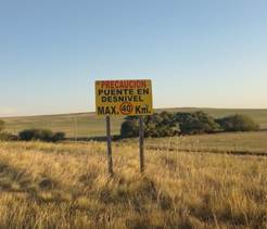 A diferencia de las producciones lingüísticas registradas en el paisaje urbano, la amplia mayoría de las observables en las vías de circulación transitadas en el espacio rural derivan de la agencia oficial, en coincidencia con lo observado en España por Fernández Juncal (2019, p. 51). Esas producciones top-down se orientan a la demarcación del espacio y el ordenamiento de la circulación, como en el paisaje urbano, y suelen contener nombres propios: por un lado, los nombres de cursos hídricos, elevaciones orográficas y otros sitios de importancia se exhiben de modo próximo a ellos y, por otro lado, los nombres de localidades tanto se visibilizan en sus caminos de acceso como en los carteles de señalización (como el que muestra la Figura 8) que indican la distancia que se debe recorrer para llegar a cada una, por lo que se reiteran en diversas ubicaciones. Sin embargo, el paisaje rural difiere en este aspecto del paisaje urbano en al menos dos sentidos: por un lado, la instancia decisoria definitiva sobre esa toponimia no es local, sino provincial o nacional, lo cual impide llevar adelante una comparación con la odonimia urbana en relación con las lenguas empleadas; por otro lado, esas denominaciones no tienen el mismo protagonismo que los odónimos en la ciudad: les es disputado por la exhibición de la más variada información, relativa tanto a la circulación en general -los recordatorios del uso obligatorio de luces o del cinturón de seguridad, por ejemplo- como, y principalmente, a sus particularidades -como lo ejemplifican los números telefónicos de emergencia, la información sobre el estado de la calzada, las alertas sobre desvíos por obras o pasos ferroviarios sin barreras y la señalización de lugares inundables-. Así, si la agencia top-down se visibiliza en la ciudad principalmente a través de la omnipresencia de los nomencladores, cuya función se reparte entre la identificación de la ubicación y la orientación de la circulación, en el paisaje rural cobra especial importancia la procuración expresa de seguridad, ejemplificada en la Figura 9.