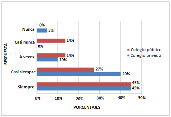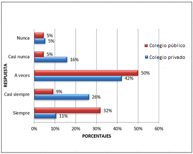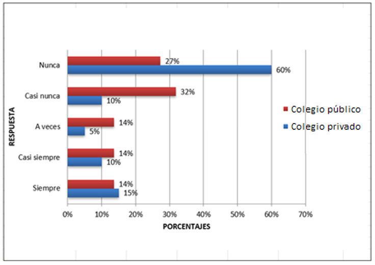 En la Figura 6, llama la atención que el 50% del estudiantado del colegio público manifiesta que a veces les agrada trabajar en grupo y un 42% del estudiantado del colegio privado señala esta misma tendencia. Para ambas instituciones, el 50% del estudiantado dice que nunca les gusta trabajar en grupo con sus pares. Cabe decir que “la creciente participación del joven con sus pares es una fuente importante de apoyo emocional durante la compleja transición de adolescencia, pero también una fuerte presión para el comportamiento que los pares rechazan” (Papalia et al., 2004, p. 492). Este resultado conduce al hecho de poder cuestionar su competencia o habilidades sociales que poseen. Esto debido al puntaje medio obtenido como resultado de lo que manifestaron las personas adolescentes, en cuanto al desagrado de trabajar grupalmente con sus pares.