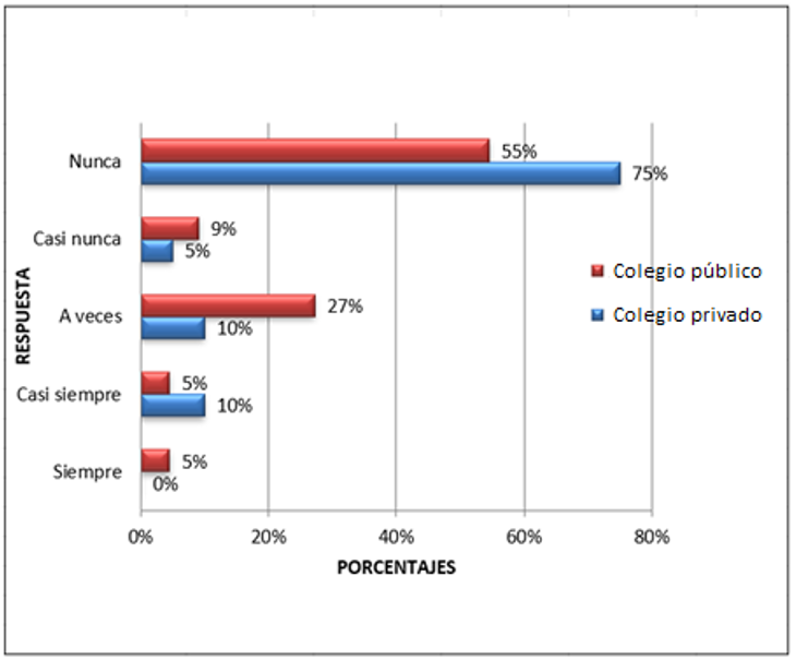 La Figura 4 se relaciona con la autoimagen social. Así, el 27% y el 30% del estudiantado señaló que nunca llevan a cabo esta conducta (burlarse de mí). Junto con la respuesta casi nunca se tiene que, entre ambas instituciones, el porcentaje oscila entre 50% y el 55%. Llama la atención que el 32% del estudiantado del colegio público manifestó que a veces se burlan de ellos y un 25% del estudiantado del privado indican lo mismo; mientras que un 20% de adolescentes del colegio privado y un 18% del público dicen que casi siempre o siempre se burlan de ellos y ellas. Por tanto, se debe tener presente lo que afirma Santrock (2004): “para demasiados adolescentes, lo más importante en su vida es cómo los perciben sus compañeros. Algunos harían cualquier cosa por formar parte del grupo. Para ellos, ser excluido es sinónimo de estrés, frustración y tristeza” (p. 152). Las consecuencias negativas que se pueden presentar en las personas adolescentes, con la situación planteada por el estudiantado en relación con la burla por parte de sus pares. es el deterioro de la autoestima, lo que provoca inseguridad, falta de atención a las tareas escolares y, finalmente, pueden llegar hasta manifestar trastornos de conducta.