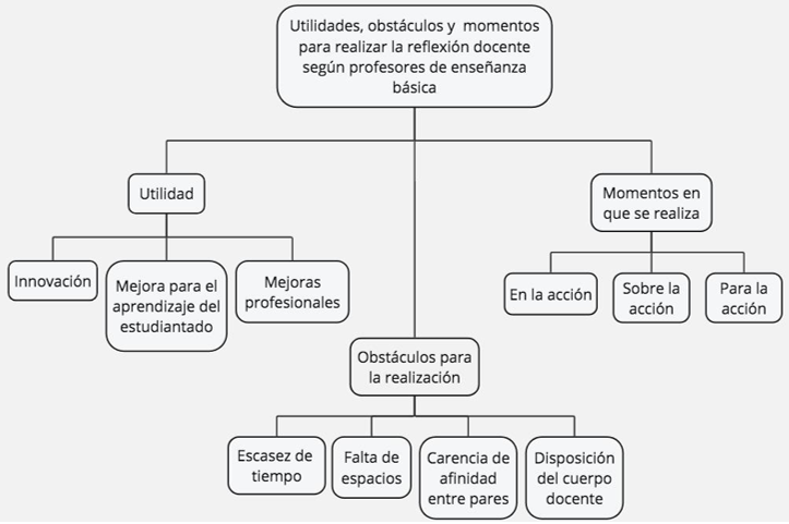 La presente investigación buscó analizar las percepciones de profesores y profesoras en ejercicio de educación básica en relación con la utilidad de la reflexión docente. Es por esto que al realizar el análisis de las entrevistas se identificaron tres temas principales junto a sus respectivos códigos, estos son: utilidad, que contiene la innovación, mejoras para el aprendizaje del estudiantado y mejoras profesionales. En segundo lugar, Obstáculos, donde se presentó el tiempo, espacios, afinidad y disposición. Finalmente, momentos en que se realiza, cuyos códigos son: en la acción, sobre la acción y para la acción.