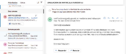 Once the previous steps are completed, the phishing mail is sent, as shown in Fig. 10. As it was said before, the sender is ''notificacionesgye@ups.edu.ec'' and the recipient would be the users of the list of students obtained in Google Dorks. However, following the guidelines of ethical hacking, the email of the authors is used to perform this scenario.