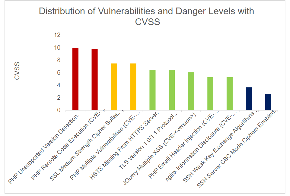 Vulnerabilities classified as medium-risk, such as the lack of HSTS on the HTTPS server and the detection of obsolete TLS versions, also represent considerable threats. Finally, low-risk vulnerabilities are shown, such as enabling weak algorithms for SSH key exchange and CBC ciphers on the SSH server, which, although less critical, are still important to address in order to strengthen the overall security of the system.