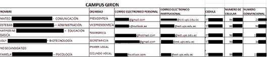 In this stage, information is collected from the victims. For this project, this information was obtained through Google Dorks, as shown inFig.8 . A list of students was obtained, where private information such as full names, career, ID, cell phone number, and personal and institutional mail was found, thus proving the vulnerability of the institution to access sensitive user data and its subsequent exploitation and attacks on these accounts or networks.