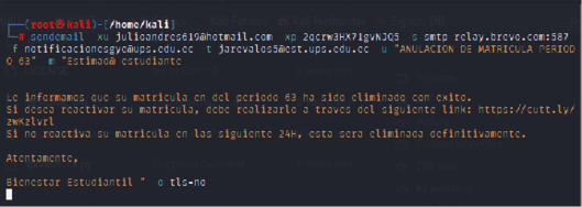 In this part, the domain and sender impersonations are performed. The domain ''ups.edu.ec'' is used to make the email appear to be legitimate from a university authority. The sender used by UPS to send notifications to students (''notificacionesgye@ups.edu.ec'') is utilized. This increases the success rate of phishing mail. Also, to use spoofing in Kali Linux, the ''send email'' tool is used, which has abundant commands that are necessary for this purpose. Once the commands are ready, the phishing mail is sent, as shown in Fig. 9.