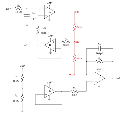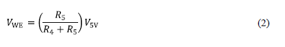 Nótese que el voltaje de contador y el voltaje de celda son variables diferentes. Considerando ahora el circuito de control propuesto, el cual se muestra en la Fig. 1, se debe notar que el voltaje de trabajo (VWE) es generado por el amplificador operacional D, a partir del divisor de voltaje formado por las resistencias R4 y R5 las cuales están en serie con la fuente de alimentación del sistema. Entonces, se puede definir el voltaje de trabajo de la siguiente manera:
