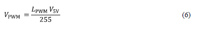 En(6), se ha considerado una señal PWM generada a partir de un registro de 8 bits, como en el caso de la placa Arduino UNO, por lo que el máximo ancho de pulso sería de 28 − 1 = 255. Despejando el ancho de pulso (LPWM) de la ecuación anterior, se tendría lo siguiente en (7):