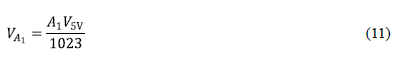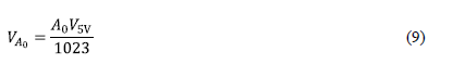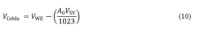 En (9), A0 es el dígito registrado por el puerto analógico 0, que puede ser un valor entre 0 y 1023. Entonces, considerando que el voltaje VA0 es igual al voltaje de Referencia VRE, el voltaje de celda estaría dado por la siguiente relación mostrada en (10):