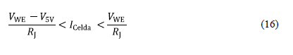 Este resultado permite identificar el rango de corrientes de celda que se pueden medir con un cierto valor de RJ. Cualquier corriente de celda que esté fuera de este rango ocasionaría un voltaje excesivo en dicha resistencia, por lo que aparecería un voltaje diferencial significativo en el amplificador. Esto, a su vez, haría que el voltaje de trabajo se desvíe del valor indicado en (3), por lo tanto, ya no se podría considerar como un valor constante, lo que hace inválida la medición de corriente.