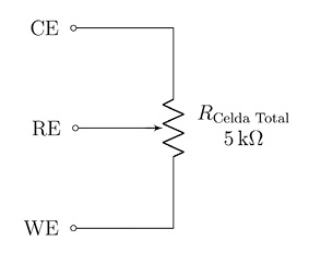 En un potenciostato, se tienen tres electrodos denominados contador (CE), referencia (RE) y trabajo (WE). Los voltajes entre cada uno de estos electrodos y el nodo de referencia o tierra del circuito se denominan VCE, VRE y VWE, respectivamente. Por otro lado, el voltaje de celda se define como la diferencia entre el voltaje de trabajo (VWE) menos el voltaje de referencia (VRE), como se indica en la siguiente ecuación: