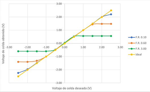 Los resultados presentados muestran la dependencia entre el voltaje de celda obtenido y el valor del factor resistivo. En las Figs. 4 y 5, se observa que el factor resistivo afecta la capacidad del circuito para fijar un voltaje de celda deseado y puede reducir el rango de valores donde el voltaje de celda obtenido iguala al voltaje de celda deseado. Los valores bajos del factor resistivo favorecen un rango más amplio de voltajes de celda que se pueden obtener en el circuito. Por ejemplo, en la Fig. 4, se tiene un rango útil de voltajes de celda entre -2 V y +2 V, para un factor resistivo de 0.10. No obstante, para un factor resistivo de 3.00, este rango se reduce a voltajes de celda entre -0.5 V y +0.5 V.